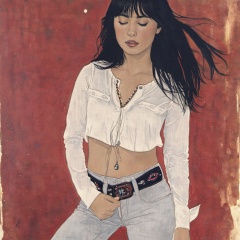 <lora:ukiyo-e_xl:1>,1girl, solo, wf shirt, long hair, white skirt, bangs, skirt, shirt, black hair, long sleeves, navel, jewelry, closed mouth, standing, closed eyes, white shirt, cowboy shot, earrings, midriff, pants, mole, lips, crop shirt, mole under eye, facing viewer, realistic, red lips, hoop earrings, white pants, the background is softly lit, giving the image a calm and tranquil ambiance, young woman, long black hair, serene expression, eyes closed, lips slightly parted, fit, pulling it slightly down, calm and tranquil ambiance, background
