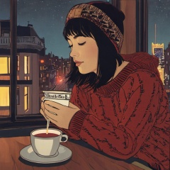 <lora:ukiyo-e_xl:1>,1girl,solo,short hair,black hair,long sleeves,hat,holding,sitting,closed eyes,indoors,sweater,cup,profile,phone,table,cellphone,steam,plate,beanie,drinking,red sweater,city lights,restaurant,from side,window,night,holding cup,smartphone,an animated character,possibly a young girl,sitting in a dimly lit room,she is wearing a winter sweater with a patterned design and a beanie hat,holding a cup possibly containing a warm beverage and is looking out of a window,the window offers a view of a cityscape with neon lights including a sign that reads 'motel',the room has a wooden table with a few items on it including a plate with a piece of bread and a smartphone,serene and introspective with a touch of nostalgia,character,cityscape,neon lights,sign,bread,