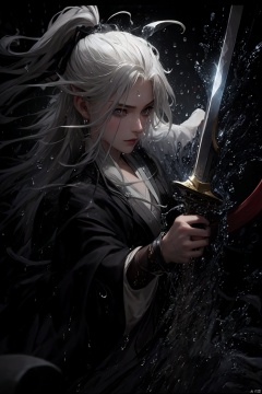 High detailed,  masterpiece,  A girl,  Half-body close-up,  solo,  female focus,  Gray hair: 1.35,  long hair,  ponytail,  (Black,  Hanfu|kimono),  Suspended water waves: 1.5,  Water Droplet Splash: 1.2,  (In the rain: 1.5),  /(Suspension: 1.3),  /,  BREAK,  Handheld: 1.31/(swords.),  Blade,  / Sword hilt,  scabbard,  Depodh) /,  special effects,  holographic display,  fine gloss,  full length shot,  Oil painting texture,  (Black Background: 1.3),  3D,  Futurism,  ray tracing,  reflection light,  anaglyph,  Surrealism,  motion blur,  cinematic lighting,  motion lines,  Depth of field,  ray tracing,  sparkle,  UHD,  8K,  best quality,  textured skin,  1080P,  ccurate,  lamer,  splash water,<lora:EMS-278642-EMS:0.300000>
