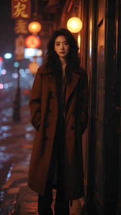 sdmai, fanhua, 1girl, solo, jewelry, long hair, looking at viewer, earrings, blurry, coat, black hair, standing, hands in pockets, night, pants <lora:SDMAI繁花肖像写真fanhua:0.8>