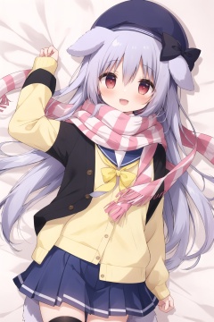 1girl,dog ears,solo,animal ears,white headwear,scarf,skirt,long hair,striped,bow,hair between eyes,red eyes,very long hair,striped scarf,pleated skirt,bangs,smile,hat,:d,long sleeves,open mouth,bed sheet,dog girl,black bow,lying,on back,beret,sleeves past wrists,purple skirt,sailor collar,dog tail,looking at viewer,cardigan,school uniform,thighhighs,hair bow,striped bow,blue bow,serafuku,fang,yellow jacket,dakimakura (medium),shirt,purple bow,