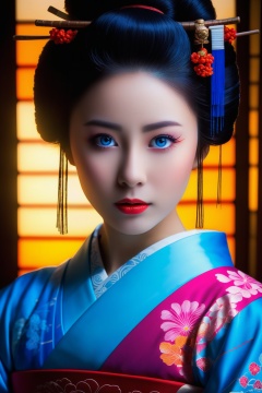 breathtaking (looking at viewer:1.3), (Geisha with Blue eyes:1.1) (Geisha portrait:1.2), Japanese cityscape background, light rays, backlit, vivid colors, vibrant colors, intricate details, intricate line drawing, masterpiece  , masterpiece, award-winning, professional, highly detailed
