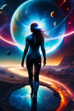 Mysterious figure walking down an epic winding path through space nebula planets sun by Raymond Swanland :: Anna Dittmann :: Anne Stokes :: Greg Olsen :: photorealistic :: hyperdetailed :: vibrant deep colors