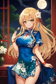 1girl, solo, long hair, breasts, looking at viewer, smile, bangs, blonde hair, large breasts, thighhighs, dress, holding, jewelry, closed mouth, green eyes, standing, ahoge, short sleeves, cowboy shot, earrings, black thighhighs, indoors, bracelet, window, night, blue dress, arm support, chinese clothes, floral print, moon, night sky, china dress, hand fan, pelvic curtain, full moon, side slit, folding fan, holding fan