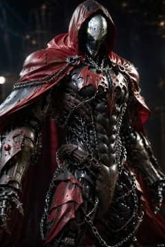 a photograph of spawn, balanced composition, made of black goo, (weathered patina:1.2), black costume, animated red cape made of liquid, "M" on chest, chains, moody lighting, cinematic, complex robot, biomechanical, hyper detailed   comprobo, Cyborg
