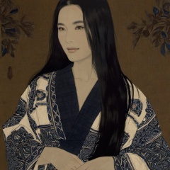 <lora:ukiyo-e_xl_v2:1>,1girl, solo, long_hair, looking_at_viewer, smile, black_hair, closed_mouth, upper_body, japanese_clothes, kimono, head_tilt, unmoving_pattern, seigaiha, asa_no_ha_\(pattern\), black_eyes, lips, a portrait of a woman with long and dark hair, She has a serene expression and with her eyes looking directly at the viewer, The woman is wearing a traditional-looking garment with intricate patterns, predominantly in shades of blue and white, The background is a muted brown and which contrasts with the vibrant colors of her attire, There's also a signature or mark on the top right corner possibly indicating the artist's name or the year of creation, woman, long, dark, hair, serene, expression, viewer, traditional-looking garment, intricate patterns, shades of blue and white, muted brown, signature, year of creation