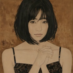 <lora:ukiyo-e_xl_v2:1>,1girl, solo, looking_at_viewer, short_hair, black_hair, dress, bare_shoulders, brown_eyes, closed_mouth, upper_body, medium_hair, black_dress, lips, floral_print, own_hands_together, interlocked_fingers, brown_background, collarbone, black_eyes, own_hands_clasped, a portrait of a young woman with long and dark hair, She has a contemplative expression and with her eyes gazing slightly downward, The woman is wearing a sleeveless top with a dark pattern possibly floral or abstract, The background is a muted brown and which contrasts with her dark hair and attire, The artwork appears to be a painting possibly created using traditional techniques, given the visible brush strokes and the texture of the canvas, young woman, long dark hair, contemplative expression, sleeveless top, dark pattern, muted brown, artwork, traditional techniques