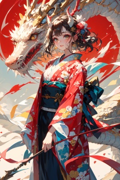 Dragon and girl, 1girl, dragon, weapon, eastern dragon, arrow \(projectile\), bow \(weapon\), japanese clothes, flower, holding, brown hair, short hair, sash, hair ornament, standing, quiver, holding bow \(weapon\), wide sleeves, holding weapon, kimono, long sleeves, obi, horns<lora:Dragon and girl_20240204154651-000010:1>,