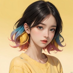 illustrator, anime, realistic, 1girl, lip, Sweater, order, Yellow gradient background, Neon hair, Textured crop, Canadian, (masterpiece, best quality)