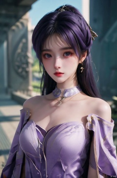 HDR, UHD, 8K, A real person, Highly detailed, best quality, masterpiece, 1girl, realistic, Highly detailed, (EOS R8, 50mm, F1.2, 8K, RAW photo:1.2), ultra realistic 8k, (best illumination, best shadow, extremely delicate and beautiful), (official art, beautiful and aesthetic:1.2),  jiziyue,1girl, solo, long hair, hair ornament, dress, bare shoulders, jewelry, upper body, purple hair, white dress, ((poakl)), Light master