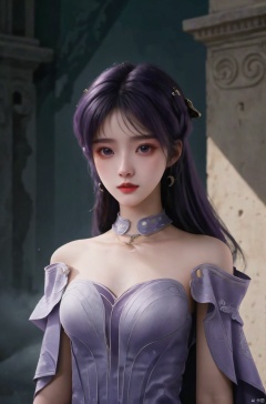HDR, UHD, 8K, A real person, Highly detailed, best quality, masterpiece, 1girl, realistic, Highly detailed, (EOS R8, 50mm, F1.2, 8K, RAW photo:1.2), ultra realistic 8k, (best illumination, best shadow, extremely delicate and beautiful), (official art, beautiful and aesthetic:1.2),  jiziyue,1girl, solo, long hair, hair ornament, dress, bare shoulders, jewelry, upper body, purple hair, white dress, ((poakl)), Light master