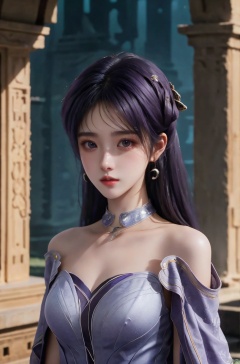 HDR, UHD, 8K, A real person, Highly detailed, best quality, masterpiece, 1girl, realistic, Highly detailed, (EOS R8, 50mm, F1.2, 8K, RAW photo:1.2), ultra realistic 8k, (best illumination, best shadow, extremely delicate and beautiful), (official art, beautiful and aesthetic:1.2), jiziyue,1girl, solo, long hair, hair ornament, dress, bare shoulders, jewelry, upper body, purple hair, white dress, ((poakl)), Light master