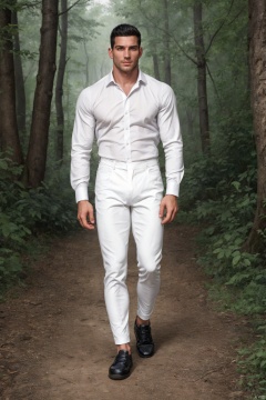 realistic, masterpiece, best quality, highres, ultra-detailed, hdr, 8k uhd, dslr, raw photo, high detailed skin,Glowing skin,Shiny skin,1boy, full body,standing,hand in pocket,male focus,solo,looking at viewer,black buzzcut headhair,facial hair,white shirt,long sleeves,collared shirt,black pants,black leather shoes,shirt tucked in,primeval forest, Sunlight