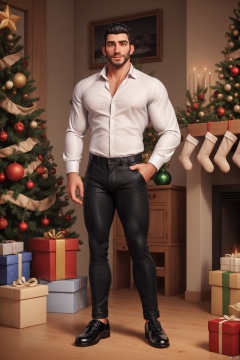 realistic, masterpiece, best quality, highres, ultra-detailed, hdr, 8k uhd, dslr, raw photo, high detailed skin,Glowing skin,Shiny skin,1boy, full body,standing,hand in pocket,male focus,solo,looking at viewer,black buzzcut headhair,facial hair,white shirt,long sleeves,collared shirt,black pants,black leather shoes,shirt tucked in,christmas, christmas tree, christmas dinner, realism