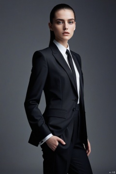 (((magazine cover: 1.4641))), magazine cover, poster, 1girl, full_body_shot, photography_studio, dramatic_photoshoot, high_contrast_lighting, dark_background, androgynous_style, tailored_suit, crisp_white_shirt, black_tie, fitted_jacket, wide_leg_pants, sleek_ankle_boots, slicked_back_hair, bold_eyebrow_arch, smoky_eyes_makeup, minimalist_jewelry, power_pose, hands_in_pockets, sharp_profile, standing_on_platform, strong_posture, shoulders_back, textured_fabric, clean_lines, buttoned_up_look, deep_gaze, fashion_forward, contemporary_portrait, cinematic_lighting, dynamic_shadows, modern_fashion_photography