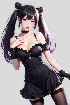 1girl,keqing (genshin impact),solo,gloves,purple hair,pantyhose,black background,hair bun,twintails,long hair,simple background,cone hair bun,hair ornament,purple eyes,dress,looking at viewer,black pantyhose,frills,detached sleeves,bangs,jewelry,breasts,black gloves,earrings,hand on own chest,choker,closed mouth,flower,bare shoulders,double bun,frilled sleeves,frilled dress,standing