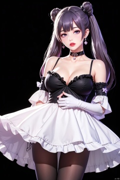 1girl,keqing (genshin impact),solo,gloves,purple hair,pantyhose,black background,hair bun,twintails,long hair,simple background,cone hair bun,hair ornament,purple eyes,dress,looking at viewer,black pantyhose,frills,detached sleeves,bangs,jewelry,breasts,black gloves,earrings,hand on own chest,choker,closed mouth,flower,bare shoulders,double bun,frilled sleeves,frilled dress,standing