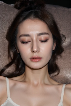 PHOTOREALISTIC,REALISTIC,masterpiece,best quality,highres,ultra detailed,8k,1woman,portrait,(strobe lighting:1.5),closed eyes, makeup,lying,on back,bed,<lora:dilireba_alexnsfw3.0:0.6>,dilireba