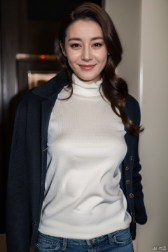 PHOTOREALISTIC REALISTIC, masterpiece, best quality, highres, ultra detailed, 8k,1woman,turtleneck,pants,cowboy shot,hotel room,(strobe lighting:1.2),looking at viewer,makeup,smile, dilireba