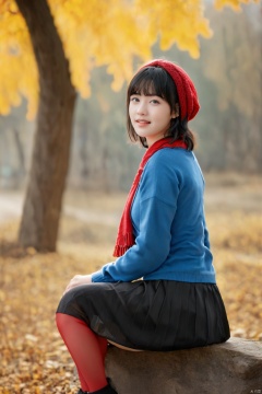 1girl,teenage, solo, short hair,smile, bangs, blue eyes, skirt, black hair, long sleeves, sitting, pantyhose, pleated skirt, outdoors, parted lips, blunt bangs, scarf, lips, blue skirt, coat, looking up, red scarf, realistic