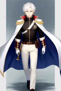 solo, looking at viewer, short hair, bangs, blue eyes, shirt, gloves, 1boy, hair between eyes, standing, jacket, full body, weapon, white hair, male focus, belt, pants, sword, white gloves, cape, white footwear, sheath, walking, white pants, white cape