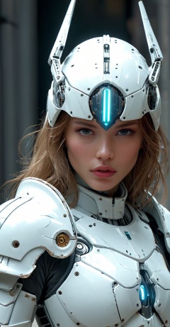 Sci-Fi Girl a fashion face with a Robo brutal white armor. Add a crown on the head. Artstation. Epic realistic, HKSTYLE