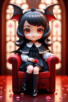 masterpiece, ((best quality)), (ultra-detailed), (illustration), an extremely delicate and beautiful girl, dynamic angle, chromatic aberration, ((colorful)),//,1girls,loli,(petite child:1.1),//,(in Gothic castle),girl with black hair,red eyes,Vertical pupil,long hair,hair arrangement,(Detailed face description),(batwing),(Gothic Lolita),(bat tail),alccandlestick,Cathedral glass,short skirt,black pantyhose,red lace,high heels,rose tattoo,throne,sitting,crossed legs,//,