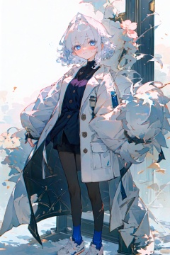 1girl, solo, looking at viewer, blush, short hair, bangs, blue eyes, long sleeves, white background, closed mouth, standing, full body, white hair, shoes, socks, medium hair, coat, sleeves past wrists, buttons, white footwear, sneakers, pocket, white coat, oversized clothes, white theme