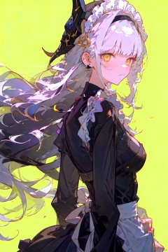 1girl, solo, long hair, breasts, looking at viewer, bangs, simple background, long sleeves, dress, jewelry, closed mouth, yellow eyes, upper body, white hair, hairband, earrings, frills, blunt bangs, black dress, from side, looking to the side, maid, maid headdress, yellow background