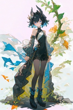 1girl, solo, looking at viewer, short hair, bangs, blue eyes, simple background, black hair, long sleeves, white background, dress, bare shoulders, closed mouth, standing, full body, boots, detached sleeves, sleeveless, puffy sleeves, black footwear, black dress, sleeveless dress, short dress, puffy long sleeves