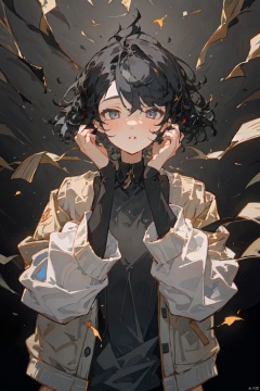 1girl, solo, short hair, simple background, shirt, black hair, long sleeves, jacket, upper body, parted lips, hands up, black shirt, floating hair, black background, hands on own face