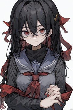 1girl, solo, long hair, looking at viewer, bangs, black hair, hair ornament, red eyes, long sleeves, ribbon, holding, hair between eyes, jewelry, closed mouth, school uniform, hair ribbon, upper body, earrings, open clothes, serafuku, sailor collar, scarf, nail polish, red ribbon, neckerchief, cardigan, red neckerchief, black serafuku, red scarf,