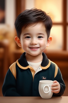 (masterpiece, top quality, best quality, official art, beautiful and aesthetic:1.2),feixing, 1boy, male focus, solo, black hair, male child, cup, smile, teeth, child, realistic, looking at viewer, mug, signature