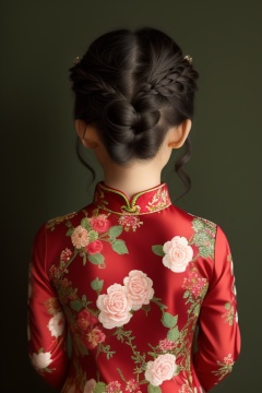 (masterpiece, top quality, best quality, official art, beautiful and aesthetic:1.2),feixing, 1girl, back view, solo, from behind, chinese clothes, black hair, braid, facing away, dress, red dress, hair ornament, nape, floral print, simple background, hair bun