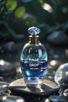 Water drop, shiny, high definition, English text, depth of field, blurred background, rock, still life, masterpiece, best quality