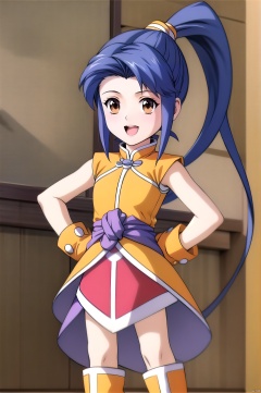 yuanshen, long hair, gloves, boots, 1girl, blue hair, ponytail, smile, very long hair, open mouth, :d, standing, brown eyes,yellow gloves, looking at viewer, hand on hip, sleeveless, index finger raised, dress, solo, skirt, ankle boots, orange background, ribbon, solo focus,nice hands,upper_body