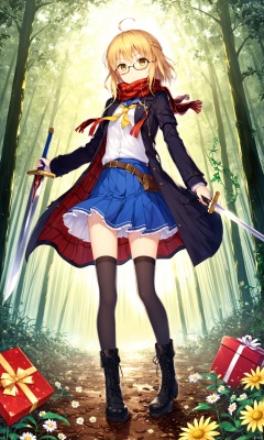 (masterpiece), (best quality), illustration, ultra detailed, hdr, Depth of field, (colorful), loli, yellow theme, the setting sun, Chamomile, Chamomile, cornflower, vines, forest, ruins, lens flare, hdr, Tyndall effect, damp, wet, 1girl, mysterious heroine x alter (first ascension) (fate), mysterious heroine x alter (fate), solo, artoria pendragon (fate), thighhighs, scarf, ahoge, sword, boots, glasses, red scarf, blonde hair, plaid scarf, weapon, looking at viewer, semi-rimless eyewear, skirt, knee boots, plaid, black-framed eyewear, under-rim eyewear, black thighhighs, valentine, holding, black footwear, gift, garter straps, full body, blue skirt, braid, yellow eyes, excalibur (fate/stay night), belt boots, heart-shaped box, school uniform, hair between eyes, jacket, open clothes, pleated skirt, fringe trim, coat, bangs, duffel coat, long sleeves, box, sidelocks, holding sword, hood, serafuku, chocolate, blush,