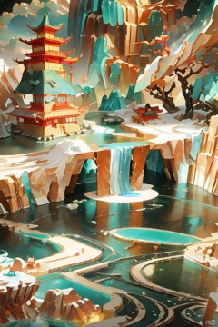 Miniature landscape, Chinese three-dimensional landscape painting, Zen aesthetics, Zen composition,  red copper mine, ore crystallization, blue mountains, flowing particles, macro lens, rich light, luminous mountains, mountains, clouds, minimalism, extreme details, incomparable details, film special effects, lifelike, 3D rendering, fine details,动漫
