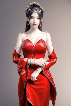 (8k, RAW photo, best quality, masterpiece:1.2),(realistic, photorealistic:1.3), ultra-detailed, extremely detailed cg 8k wallpaper,(crystalstexture skin:1.2), extremely delicate and beautiful,1girl, earrings, jewelry, solo, dress, black_hair, bare_shoulders, 3d,(full shot), (breasts, medium_breasts, cleavage), looking_at_viewer, standing,