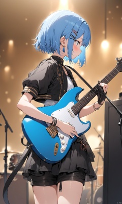 (masterpiece), (best quality), loli,1girl, solo, gloves, tassel, instrument, short sleeves, blue hair, earrings, guitar, holding, hair ornament, black gloves, jewelry, short hair, tassel earrings, shirt, cropped jacket, electric guitar, shorts, music, puffy sleeves, jacket, single glove, cowboy shot, blurry background, black jacket, holding instrument, puffy short sleeves, blurry, bangs, half gloves, frills, standing, profile, blue eyes, white shirt, from side, playing instrument, blush, hairclip