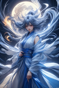 High detailed, masterpiece, Cowboy lens, A girl, solo, female focus:1.4, bangs, Medium chest, Gray hair: 1.4, long hair, White kimono, Hold a sword, Scabbard, Blue splash ink, Blue energy vortex, Blue light painting, fine gloss, Architecture, Oriental ancient architecture, Night:1.3, Starry sky, Full moon, Film and television style, ray tracing, motion blur, Depth of field, sparkle, Surrealism, Conceptual art, reflection light, UHD, 8K, best quality, textured skin, 1080P, ccurate