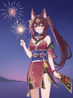 sparkle is a girl with long black twintails and pink eyes fox mask on his head,the outfit she is wearing is called 'huahuo' and it's a red off-the-shoulder kimono,1girl,fireworks,sparkler,solo,smile,looking at viewer,night,sky,night sky,grin,virtual youtuber,sash,blush,holding,masterpiece,best quality,gcg,<lora:gcg.xl-low-lr:0.7>,<lora:xl_sparkle>,