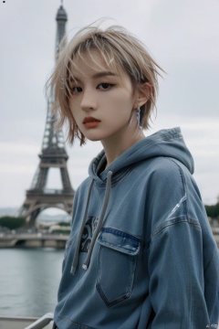 eyeliner, oversize hoodie, denim shorts, punkish, cinematic angle, Eiffel tower on background