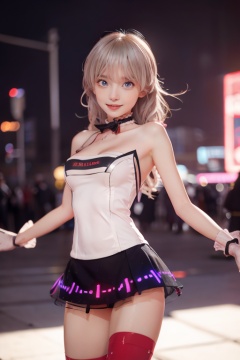 masterpiece,best quality,absurdres,highres,4k,ray tracing,perfect face,perfect eyes,intricate details,highly detailed,1girl,moyou,looking at viewer,sexy pose,(cowboy shot:1.2),<lora:Electronic_dance_skirt:0.55>,Electronic_dance_skirt,dress,bare shoulders,gloves,thighhighs,<lora:XRface:1.2:lbw=fa+>,girl,light smlie,
