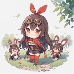 best quality,(masterpiece:1.3),fullbody,ultra-detailed,solo:1.3,1GIRL,amber \(genshin impact\) scenary,forest,goggles, long hair,gloves,shorts,brown hair,red thighhighs, cleavage, red ribbon, long sleeves, shrug \(clothing\), jacket,pouch,goggles on head,rabbit doll, <lora:amber:1>
