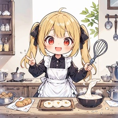 1girl,best quality,masterpiece,cute:1.2,yellow hair,red eyes,twintails,solo,white frilled collared dress,black ribbon,bangs, the angle next door,gentlely,beautiful,neighbor girl,a heartwarming smile,dynamic angel, dynamic pose,cooking breakfirst sweets,milk,dough,whisk,((apron)),worktop