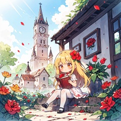 1girl, apple, blonde_hair, blood, book, bouquet, building, camellia, castle, cloud, cross, defloration, dress, falling_petals, flower, hibiscus, holding_flower, leaf, long_hair, orange_flower, outdoors, petals, pink_rose, plant, red_flower, red_rose, rose, rose_petals, sitting, sky, spider_lily, stairs, strawberry, thorns, tombstone, tower, tulip, vase, vines, watering_can, wind, backlight, colors, white pantyhose