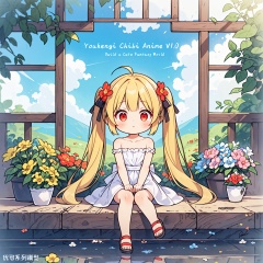 best quality, masterpiece, illustration, (reflection light), incredibly absurdres, ((Movie Poster), (signature:1.3), (English text), 1girl, girl middle of flower, pure sky,yellow hair, red eyes, twintails,clear sky, outside, collarbone, sitting, absurdly long hair, clear boundaries of the cloth, white dress, fantastic scenery, ground of flowers, thousand of flowers, colorful flowers, flowers around her, various flowers,bare shoulders,skirt, sandals,