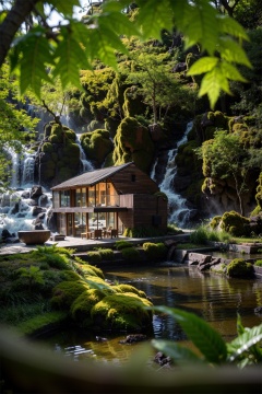 masterpiece,best quality,taixian,scenery,no humans,tree,wood house,outdoors,(fog:0.5),nature,water,moss,rock,forest,day,(light rays:0.5)