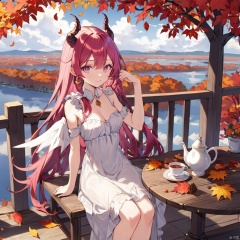 1girl, wings, long hair, solo, sitting, white dress, dress, bare arms, teapot, purple eyes, outdoors, looking at viewer, pointy ears, smile, very long hair, flower, tree, horns, demon wings, breasts, red flower, cup, table, bare shoulders, cloud, sky, two side up, demon girl, bangs, pink hair, closed mouth, water, earrings, teacup, jewelry, sleeveless dress, red hair, autumn leaves, sleeveless, small breasts, day, autumn, hair between eyes